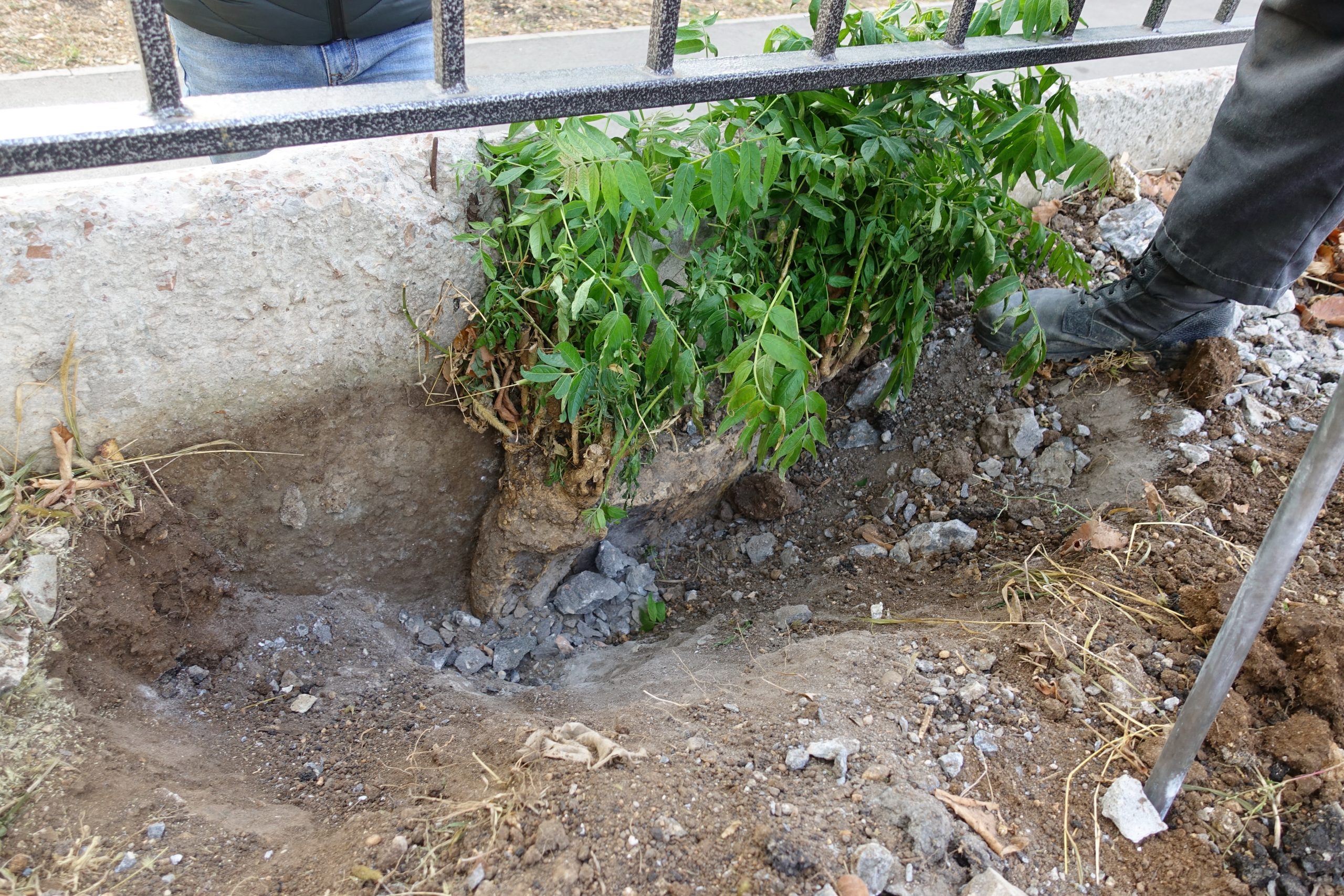 Поскольку уникальный айлант вырос между двумя бетонными плитами, с одной стороны – муниципальная собственность – тротуар и дорога, а с другой – жилой комплекс «Гармония», Алексей Стребной выяснил, что дерево проще изъять именно со стороны комплекса. Он договорился с начальником участка ОООСК «Комфорт» о том, что айлант будут выкапывать со стороны «Гармонии». Соответствующее распоряжение – помочь это сделать, дал садовникам и директор Медицинской академии КФУ Евгений Крутиков. Но, когда они прибыли на место, оказалось, что выкопать дерево с помощью одних лопат без отбойного молотка невозможно. А такого инструмента в хозяйстве вуза нет.