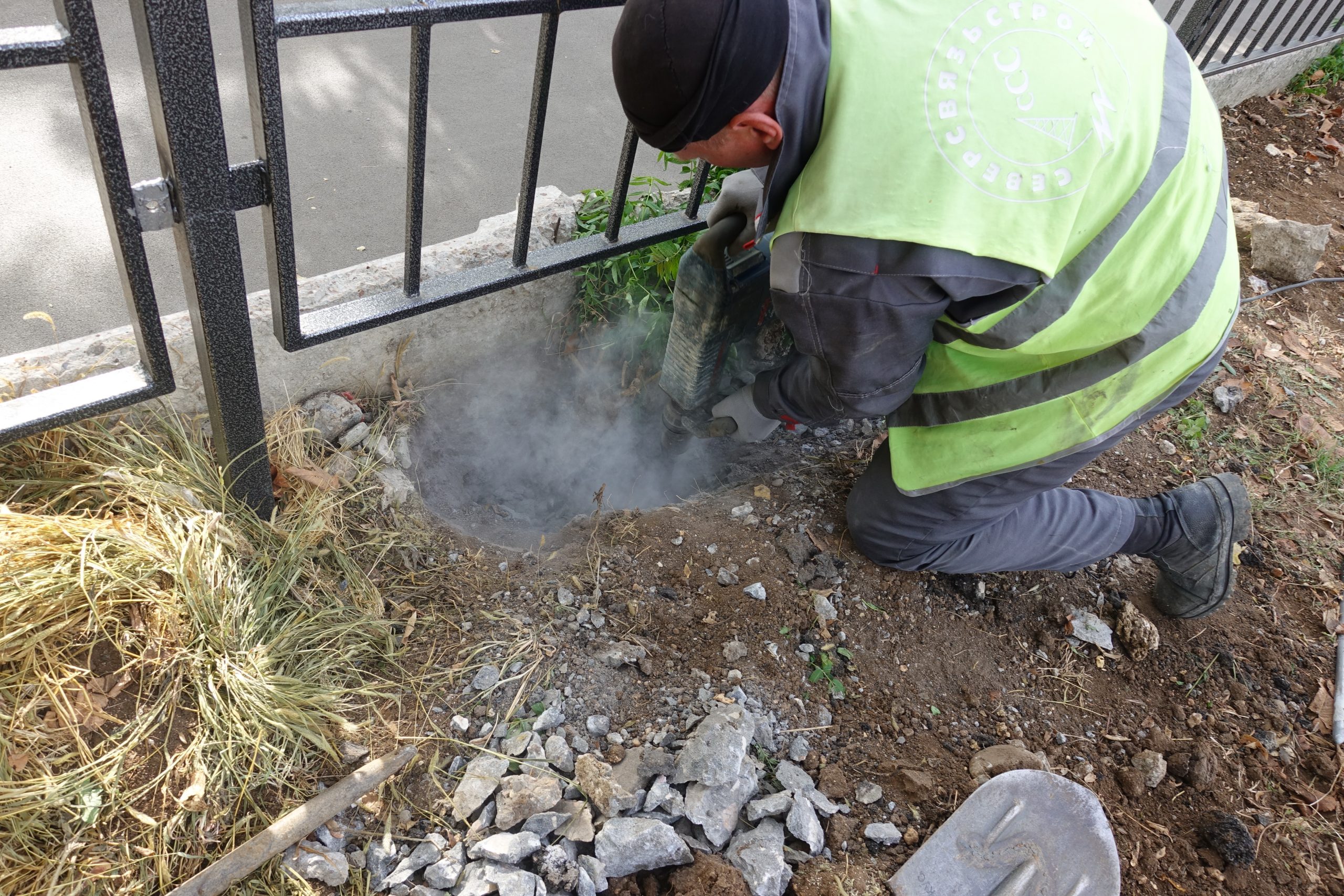 «Спецоперации» по спасению дерева-мутанта началась в определенный день и время. Алексей Стребной привез отбойный молоток и помощников, начальник участка ООО СК «Комфорт» открыл подвал одного из домов жилкомплекса, где с помощью длинного кабеля инструмент подключили. Два садовника медакадемии КФУ прибыли на место с лопатой и пилой.