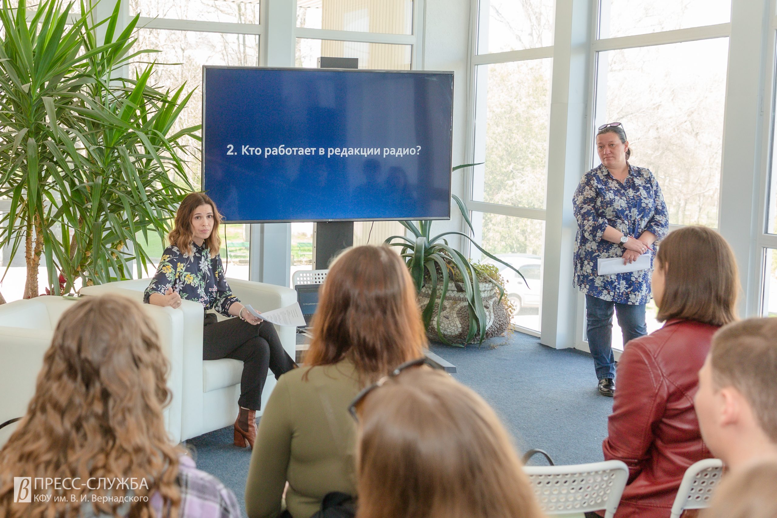 15 апреля, Крымский федеральный университет. Шеф-продюсер и обозреватель радио «Спутник в Крыму» Юлия Егошина и Светлана Калинина на открытой встрече со студентами Крымского федерального университета рассказали о том, как находить инфоповоды, общаться со спикерами и работать в условиях форс-мажора.