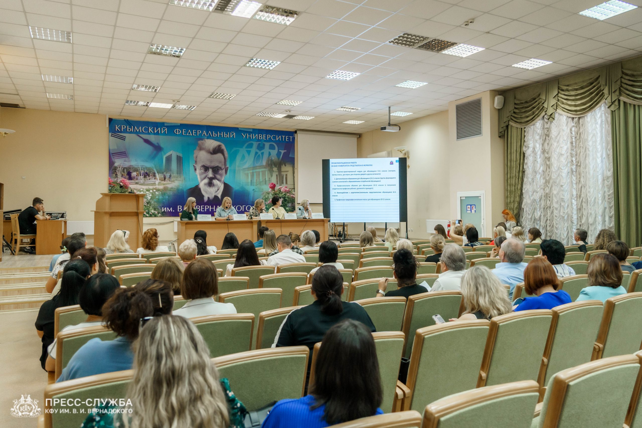 На базе Крымского федерального университета прошло совещание по вопросам реализации предпрофессионального образования и профориентационной работы. Его посетили представители министерства образования, науки и молодёжи Республики Крым, Центра опережающей профессиональной подготовки РК, отдела информационно-аналитического обеспечения Информационно-методического, аналитического центра, Информационно-методического центра округа г. Симферополя, а также руководители общеобразовательных учреждений РК и сотрудники вуза.