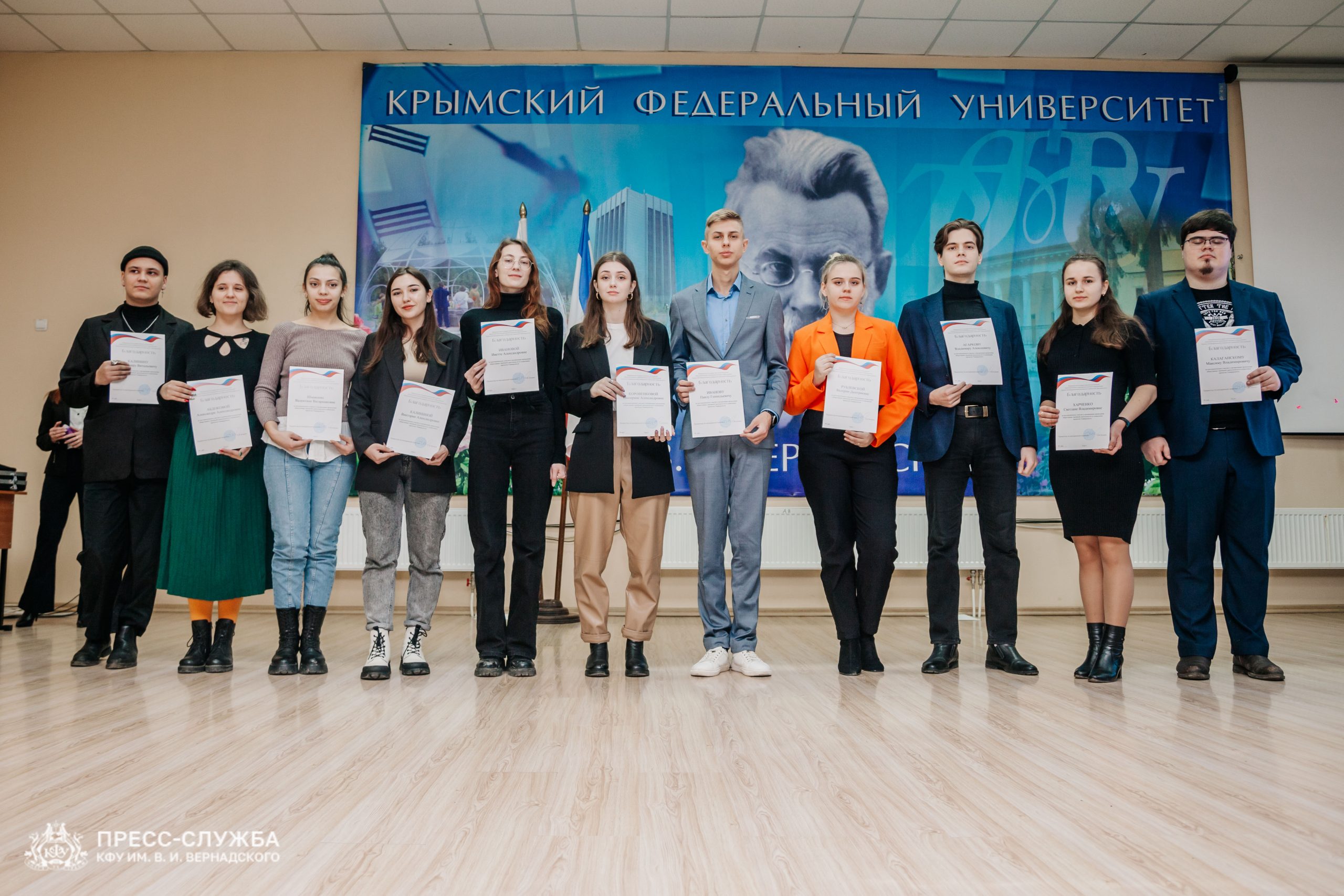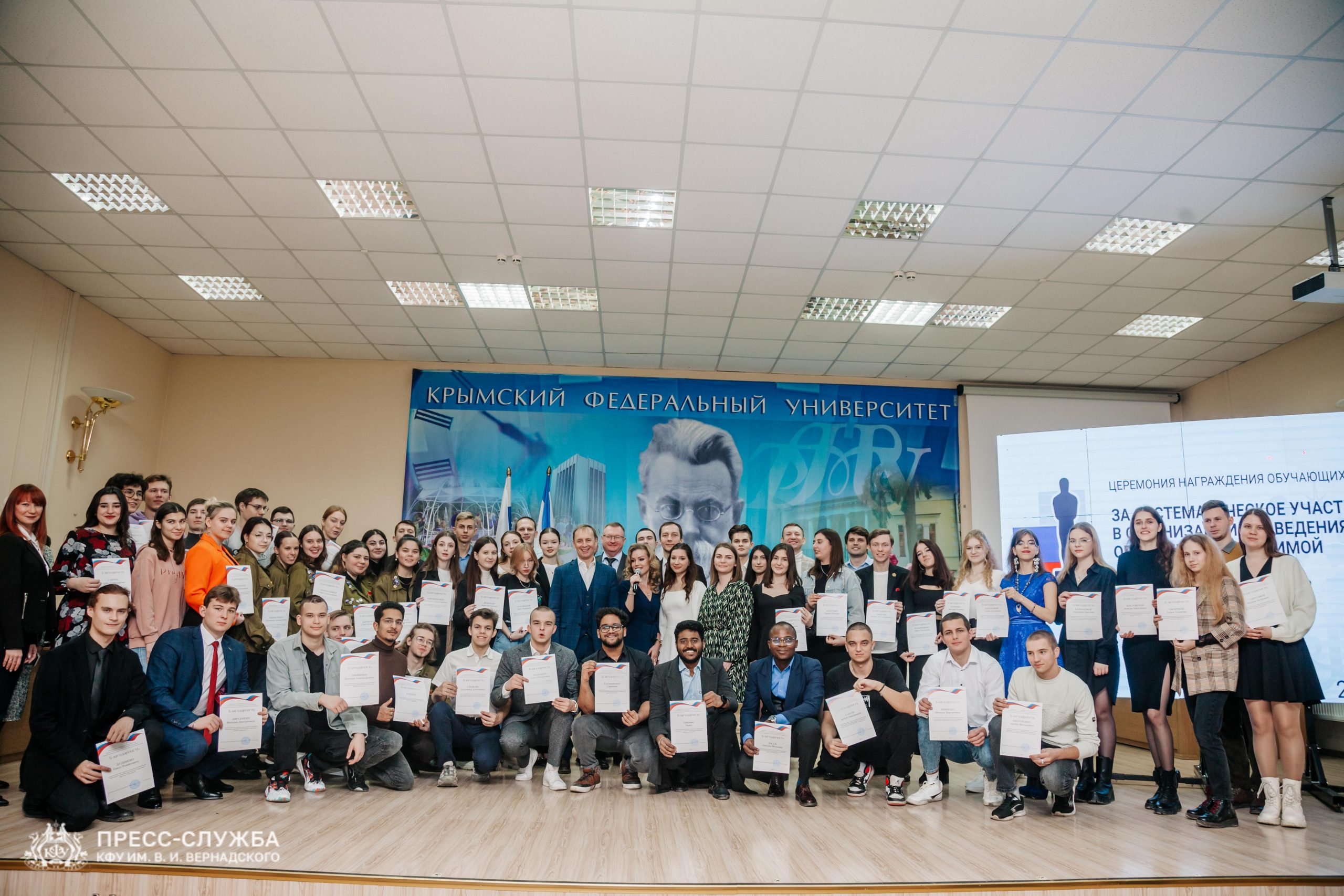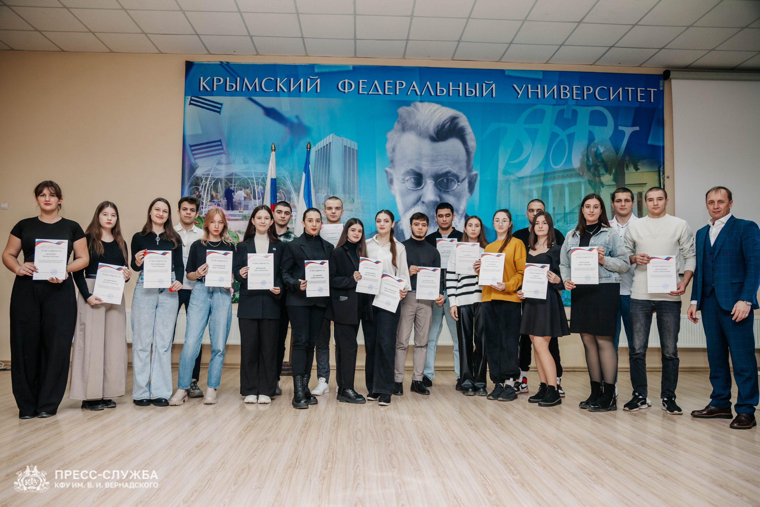 В Крымском федеральном университете в преддверии наступающего Нового года прошла торжественная церемония награждения лучших студентов, которые в течение года трудились на благо общества и представляли интересы вуза в общественной и социальной сфере.