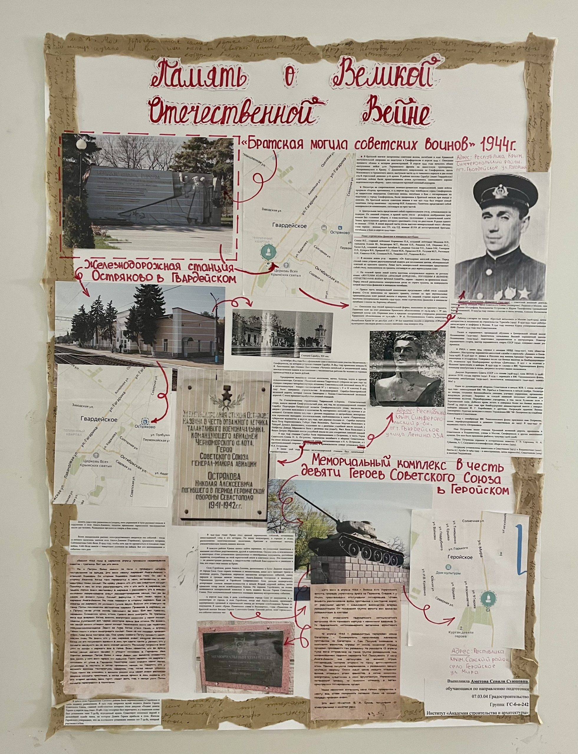 Экспозиция представляет авторские коллажи студентов-архитекторов и школьников, отражающие военную историю крымских городов через призму архитектуры, памятные места и объекты, связанные с событиями 1941-1945 годов, связь между историческими фотографиями и современным обликом городов