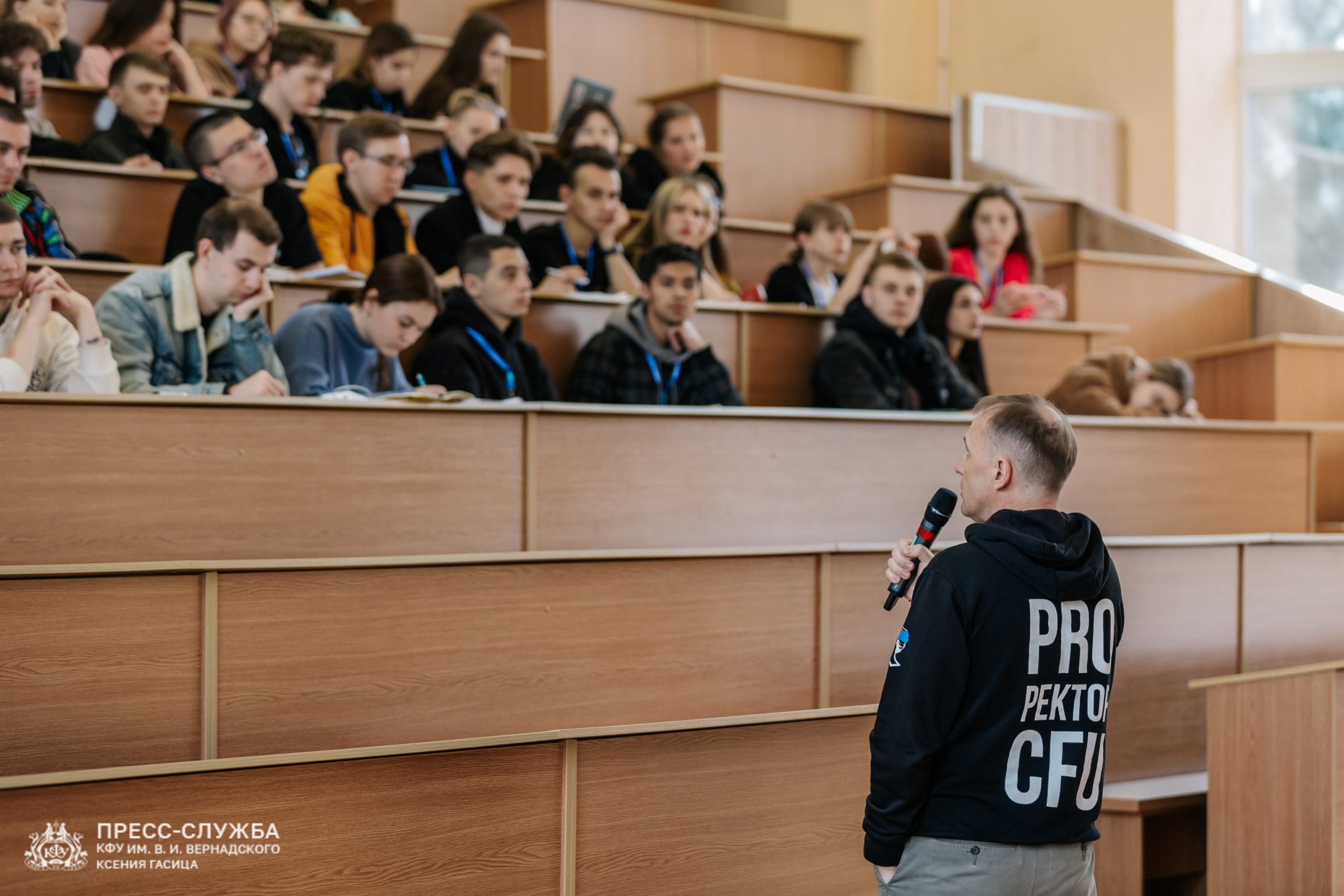С лекцией также выступил ректор Крымского федерального университета Андрей Фалалеев. Он рассказал о саморазвитии, поиске себя в социуме и ответил на вопросы студентов.