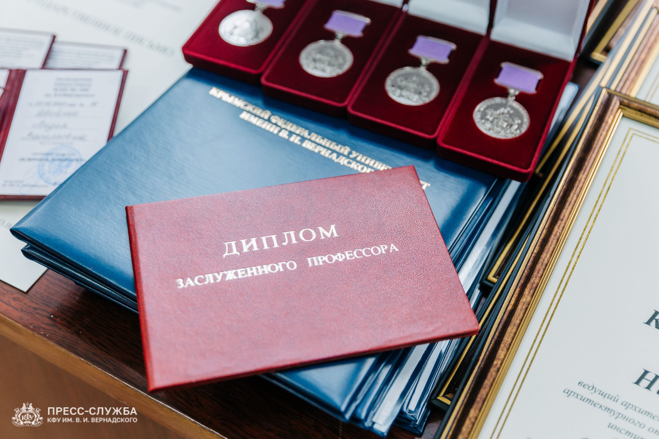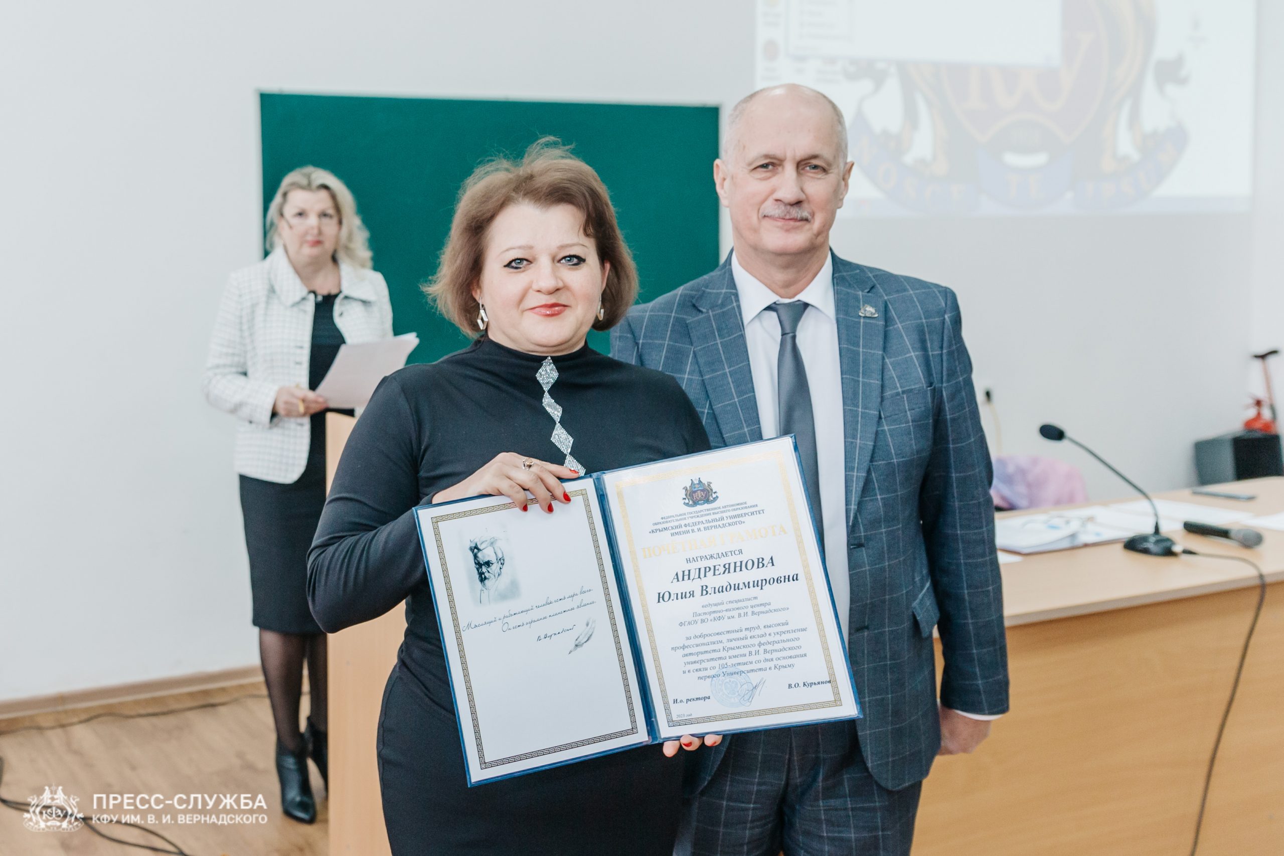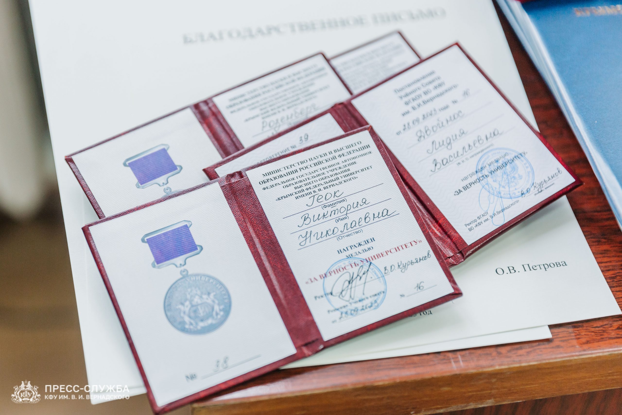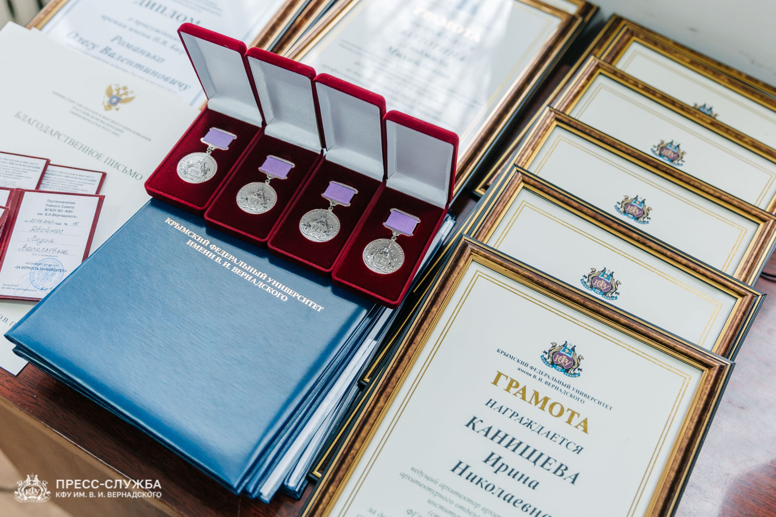 Также исполняющий обязанности ректора Владимир Курьянов вручил Премии имени Н.В. Багрова выдающимся сотрудникам, молодым ученым и обучающимся университета. Также были вручены благодарности и благодарственные письма Министерства науки и высшего образования Российской Федерации, медали «За верность Университету», почетные грамоты и звания «Заслуженный профессор Крымского федерального университета им. В.И. Вернадского» и ученые звания доцентов.