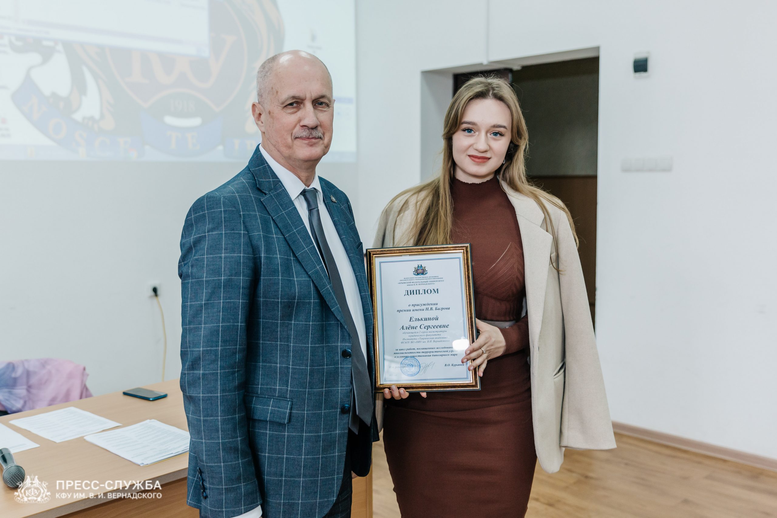 Так, Премией им. Н. В. Багрова в 2023 году в номинации «Сотрудники из числа научно-педагогических работников старше 35 лет» наградили профессора кафедры истории России Таврической академии Олега Романько за цикл работ, посвященных военно-политическим проблемам в период Второй мировой и месту Крыма в этих событиях; в номинации «Молодые ученые (до 35 лет)» – доцента кафедры патологической анатомии с секционным курсом Медицинского института Алексея Бекетова за цикл работ на тему: «Механизмы развития органопатологии при реперфузионном синдроме и инфекции SARS-COV-2»; студентку юридического факультета Таврической академии Алёну Елькину за цикл работ, посвященных исследованию многоаспектности террористической угрозы в условиях существования биполярного мира.